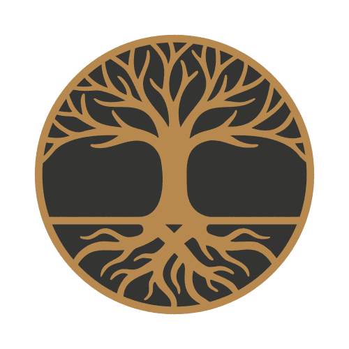 Logo for Oak Ark & Iron, a community-focused organization founded in 2026 in White Bear Lake, Minnesota, featuring a tree with roots in black outline, and text around the circle.